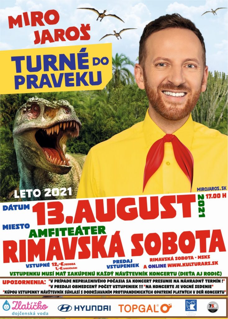 Miro Jaroš prichádza do nášho mesta s novým, letným programom, ktorý nesie názov TURNÉ DO PRAVEKU. Ako názov napovedá, tentoraz sa vydáme na dobrodružnú cestu za dinosaurami, no nezabudneme ani na Planéty či čarovné prázdniny U babičky. Na koncerte, v piatok, 13. 8. 2021 o 17.00 hod. si na amfiteátri s kapelou zaspievate a zatancujete aj na najväčšie hity ako Balón, Moje telo, Hýb sa či Strašidlá. Koncert je vhodný pre celú rodinu. Ideálny je pre deti od 3 rokov, a tie, ktoré dobre znášajú hlasnú hudbu. Na koncerte je voľné sedenie. Vstupné: 12€ / osoba, predaj vstupeniek v MsKS a online na www.kulturars.sk.