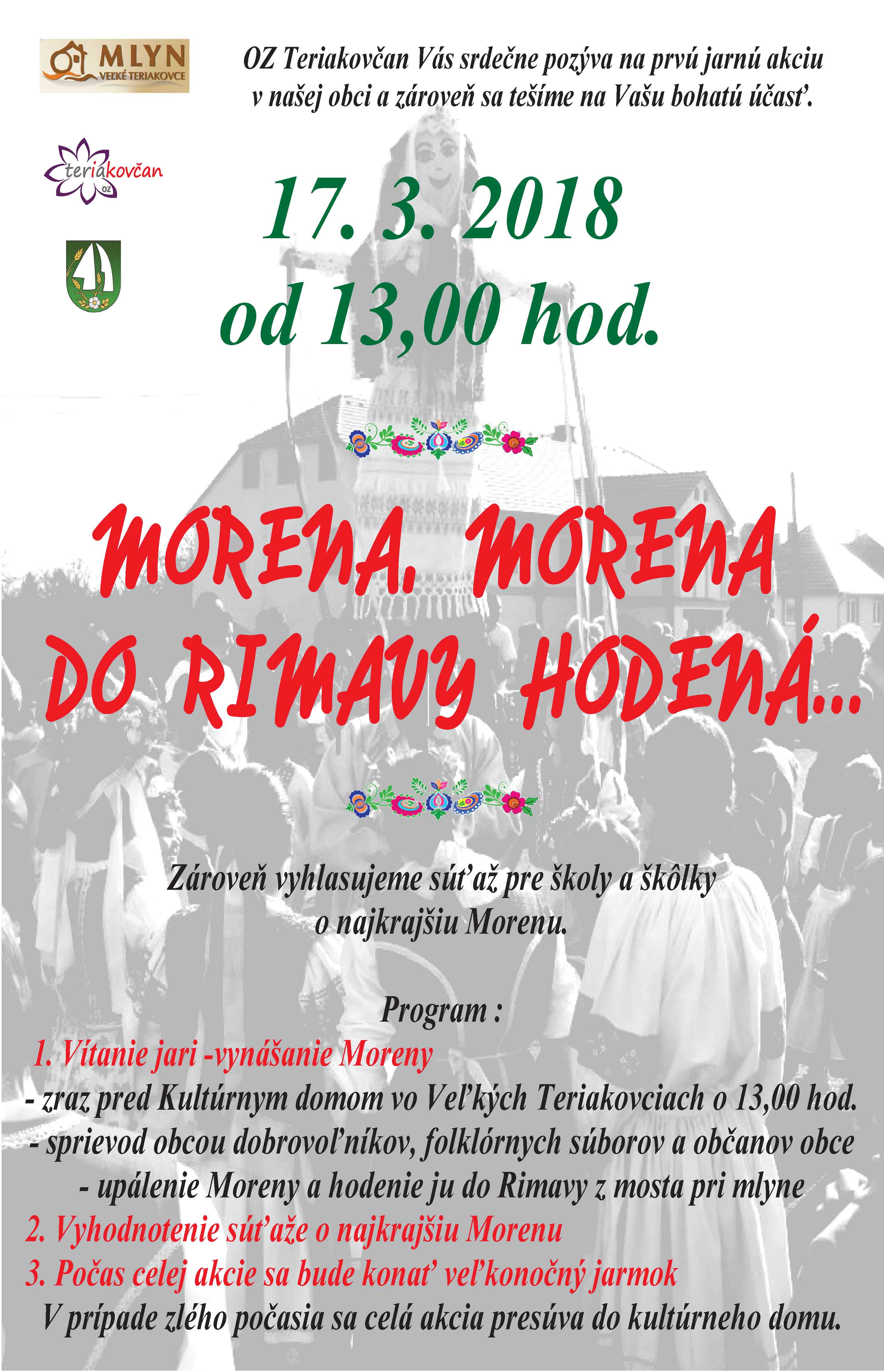 Vítanie jari- vynášanie Moreny,súťaž o najkrajšiu Morenu,počas celej akcie sa bude konať veľkonočný jarmok...