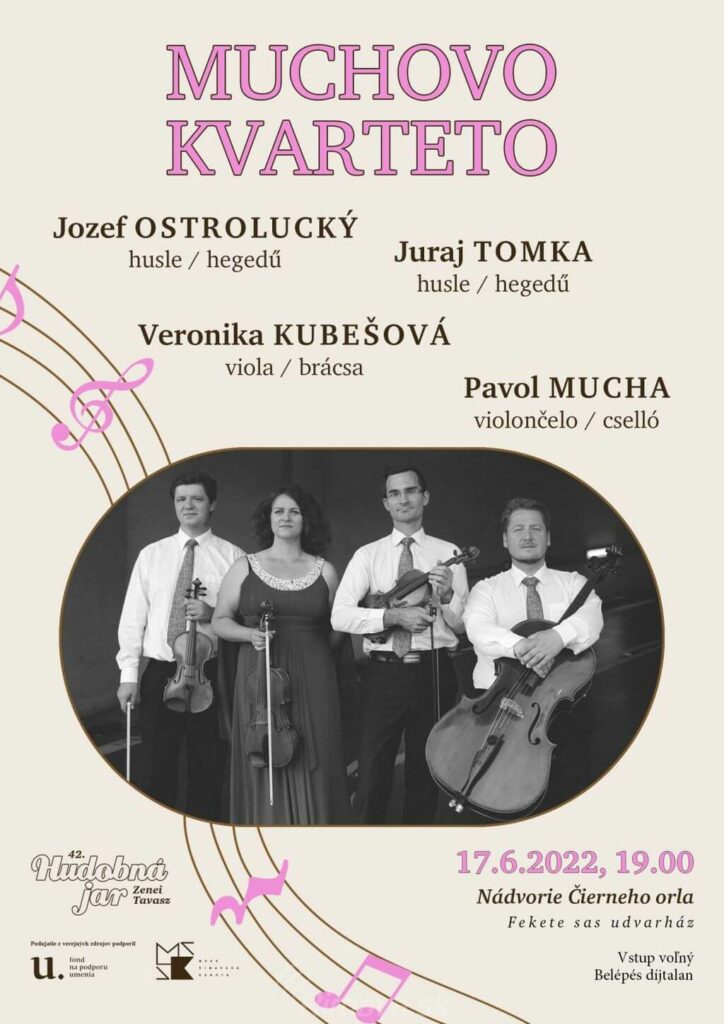 Všetkých milovníkov vážnej hudby srdečne pozývame na štvrtý koncert Hudobnej jari, koncert špičkového slovenského hudobného telesa, Muchovho kvarteta. Účinkujú: Juraj Tomka / prvé husle, Jozef Ostrolucký / druhé husle, Veronika Kubešová / viola a Pavol Mucha / violončelo. Koncert sa uskutoční v rámci celoštátnej postupovej súťaže a prehliadky Divertimento musicale 2022 na Nádvorí Čierneho orla dňa 17. 6. 2022 o 19.00 hod. Vstup je voľný. Tešíme sa na stretnutie s Vami! Podujatie z verejných zdrojov podporil Fond na podporu umenia.
