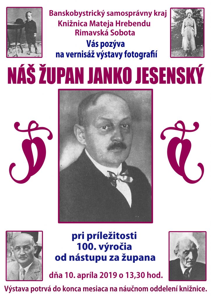 Dňa 10. apríla 2019 o 13,30 hod. sa uskutoční priestoroch náučného oddelenia Knižnice Mateja Hrebendu vernisáž výstavy Náš župan Janko Jesenský. Výstava je organizovaná pri príležitosti 100. výročia od nástupu Janka Jesenského za župana Gemersko-malohontskej župy ako posledný bod programu dňa, ktorý knižnica realizuje s spolupráci s Okresnou radou SNS v Rimavskej Sobote, s Domom Matice slovenskej v Rimavskej Sobote, s mestom Rimavská Sobota a v spolupráci s Gemersko-malohontským osvetovým strediskom. Na výstave si môžete prezrieť ilustrácie zo súkromného i politického života Janka Jesenského, ako aj ukážky jeho tvorby, ktoré pochádzajú z fondu Knižnice Mateja Hrebendu.