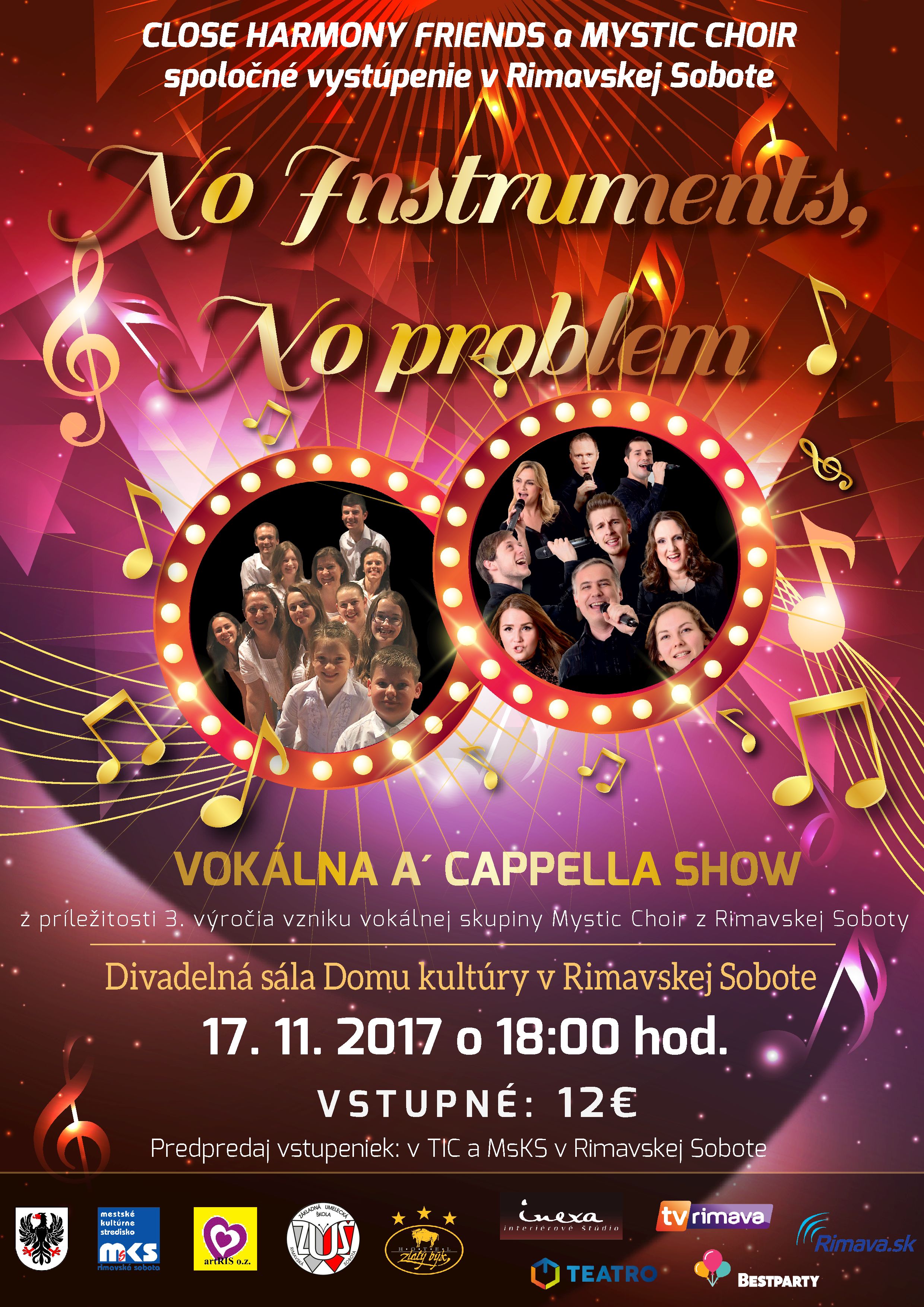 Pozývame Vás na spoločné vystúpenie známej slovenskej a cappelly Close Harmony Friends a rimavskosobotskej vokálnej skupiny Mystic Choir v Rimavskej Sobote. Koncert sa uskutoční v piatok, 17. 11. o 18.00 hod. v divadelnej sále DK pri príležitosti 3. výročia vzniku Mystic Choir. Nenechajte si ujsť narodeninový koncert Mystic Choir a neopakovateľný večer s významným hosťom Close Harmony Friends. Vstupné: 12€, predpredaj vstupeniek v TIC a MsKS.