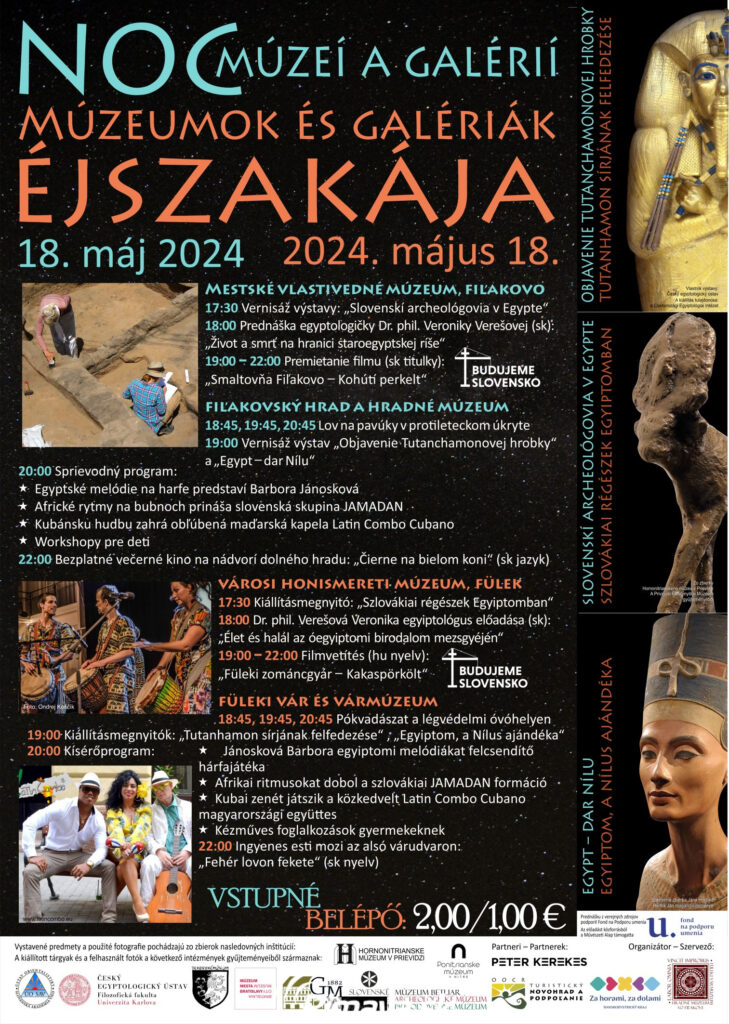 Ústrednou témou podujatia bude Egypt, ktorý svojou tajomnosťou láka nielen odborníkov, ale aj cestovateľov z celého sveta. Návštevníkov čakajú vo Fiľakove tri nové výstavy a niekoľko zaujímavostí, vďaka ktorým budú mať možnosť záživnou formou spoznať časť egyptskej histórie a kultúry. Večerný program zaháji o 17:30 hodine vernisáž prvej výstavy s názvom „Slovenskí archeológovia v Egypte" v galérii Mestského vlastivedného múzea.