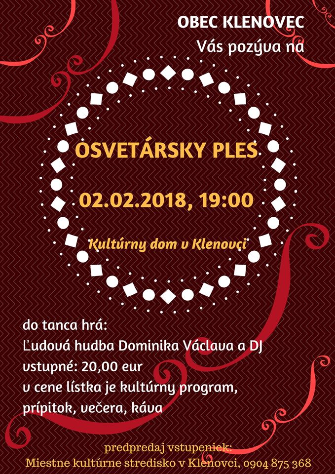 Miestne kultúrne stredisko pri Obci Klenovec pozýva na Osvetársky ples do Klenovca. Do tanca hrá Ľudová hudba Dominika Václava a DJ. V programe sa predstavia tanečníci spoločenského tanca a FS Vepor z Klenovca.
