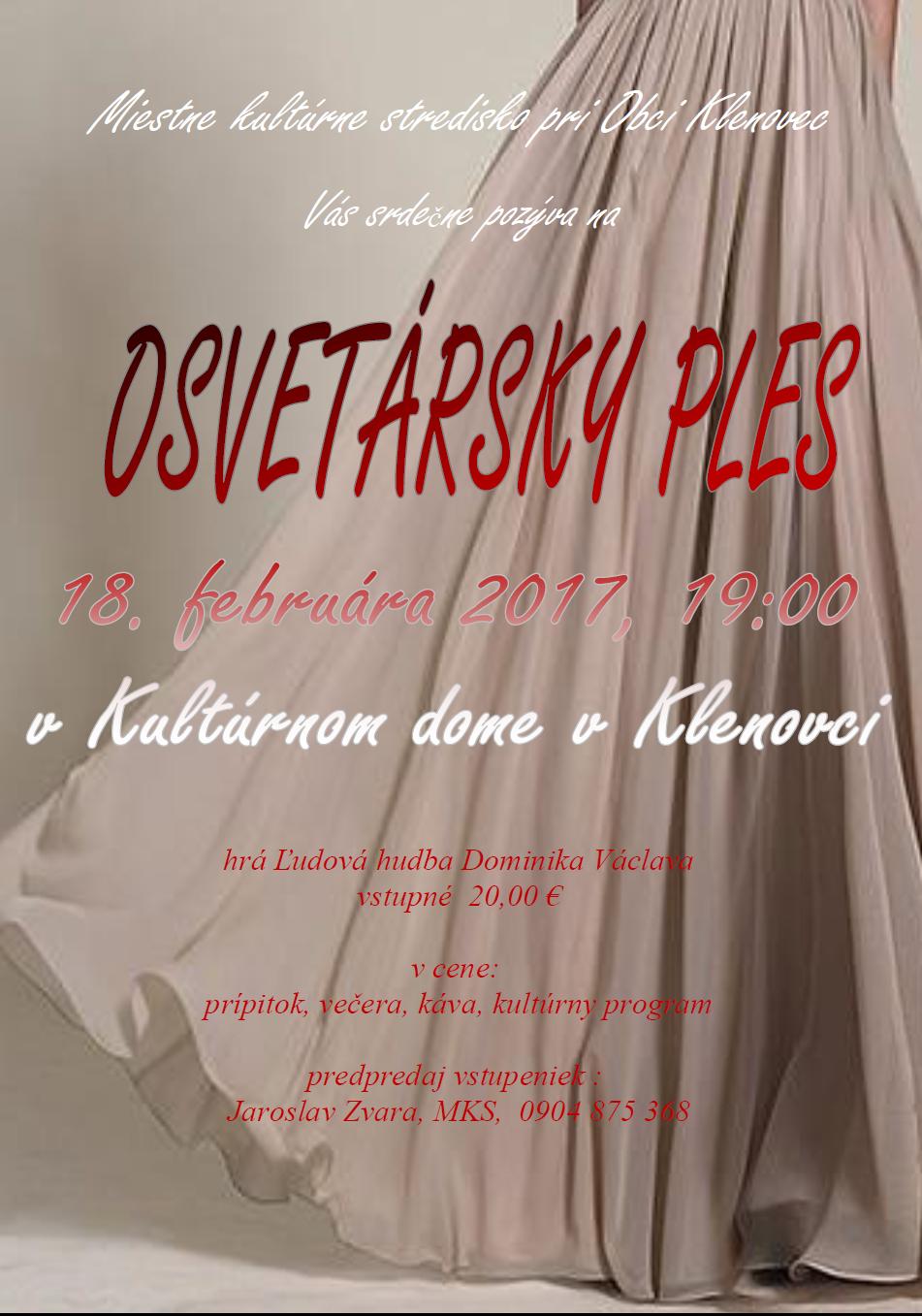 Miestne kultúrne stredisko pri Obci Klenovec Vás pozýva na Osvetársky ples, ktorý sa uskutoční 18.2.2016 v Kultúrnom dome v Klenovci. Do tanca hrá podpolianska ľudová hudba Dominika Václava a DJ.