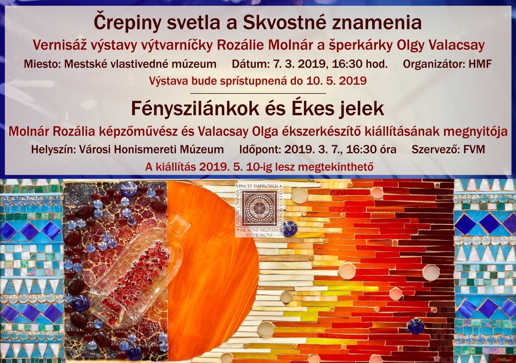 Výstava prezentuje kolekciu oslnivých sklenených mozaík a ručne vyrobených šperkov. Autorom zbierky sklenených mozaík je výtvarníčka z juhozápadného Slovenska, Rozália Molnár, ktorá pôvodne pracovala ako učiteľka výtvarnej a hudobnej výchovy. Časť jej diel, hýriaca hravými farbami, stelesňuje subjektívne vnímanie rozprávkového sveta. Názov „Skvostné znamenia“ sa vzťahuje na tematicky trochu odlišnú časť zbierky, ktorú tvoria remeselné šperky Olgy Valacsay. Výstava predstaví farebne aj tvarovo bohaté, skvostné doplnky, zdobené prevažne leštenými sklenenými korálikmi.