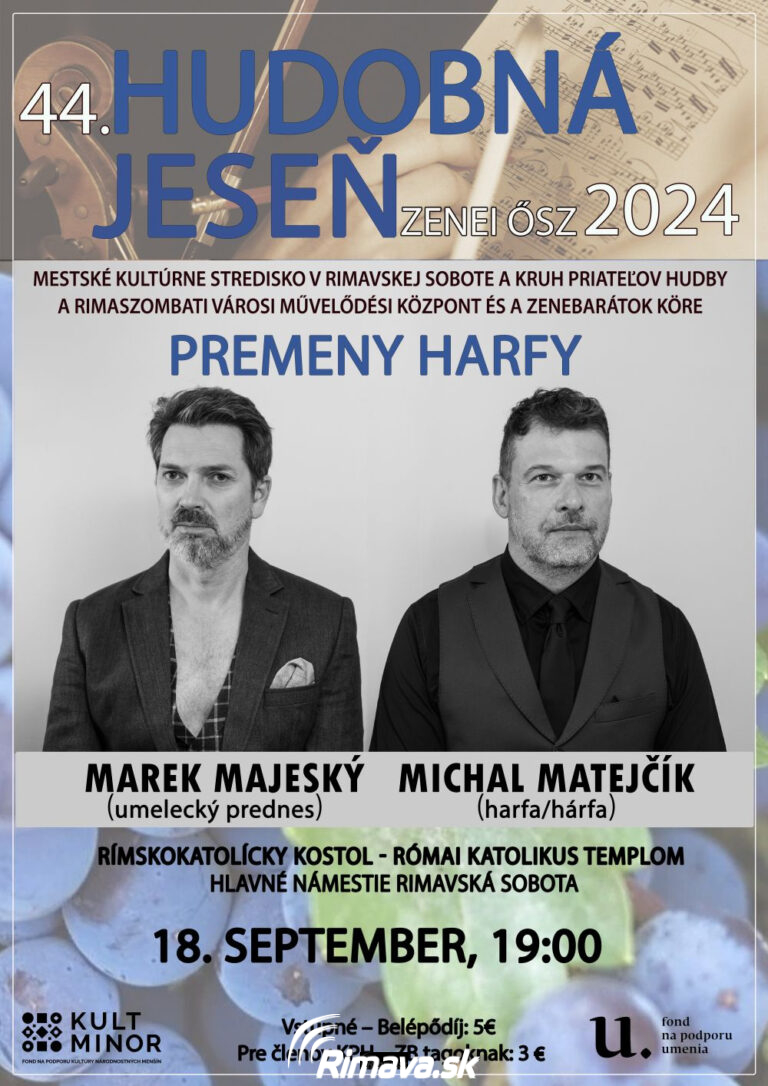 44. ročník Hudobnej jesene odštartujeme v stredu, 18. 9 o 19:00 hod. v Kostole sv. Jána Krstiteľa v Rimavskej Sobote vystúpením harfistu Michala Matejčíka a známeho herca Mareka Majeského. Ich spoločný program „Premeny harfy" nie je klasickým koncertom. Prostredníctvom[...]