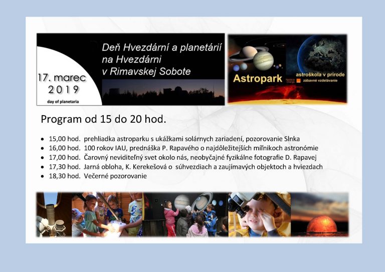 Tradičný medzinárodný deň planetárií a hvezdární s bohatým programom prednášok a pozorovaním v prípade priaznivého počasia.
