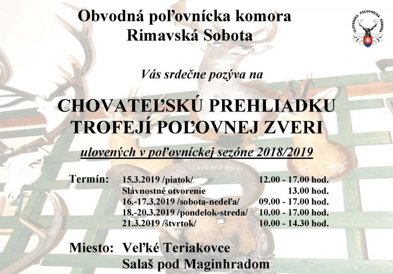 Chovateľská prehliadka trofejí poľovnej zveri ulovených v poľovníckej sezóne 2018/2019 v poľovných revíroch okresu Rimavská Sobota.