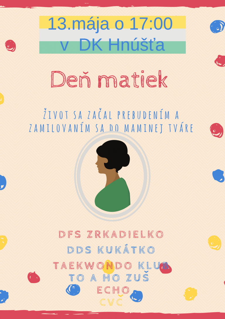 Srdečne vás pozývame na oslavu dňa matiek, kde si krásny program pripravili deti z divadelného súboru Kukátko, folklórneho súboru Zrkadielko, súboru moderného tanca ECHO, Taekwondo klubu a Základnej umeleckej školy v Hnúšti.