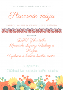 Pozývame vás na tradičné stavanie mája na námestie v Hnúšti, kde od 16-tej hodiny bude hrať Dychová hudba mesta Hnúšťa. O 17-tej hodine sa v sprievode ľudovej hudby postaví máj. Vystupujú: Detský folklórny súbor Zrkadielko[...]