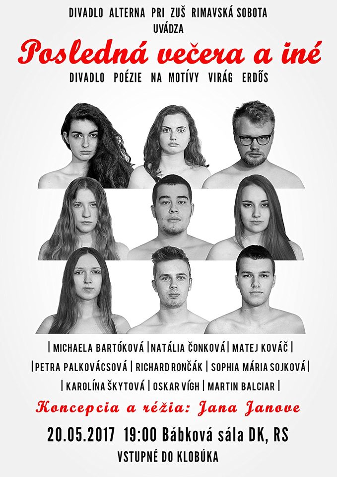 Inscenácia Posledná večera a iné vznikla z básní maďarskej poetky Erdős Virág, ktorá vníma písanie ako spoločenskú rolu a jej básňam sa najlepšie hodí prívlastok verejne angažované. V Maďarsku už zľudoveli a na jej čítačky[...]