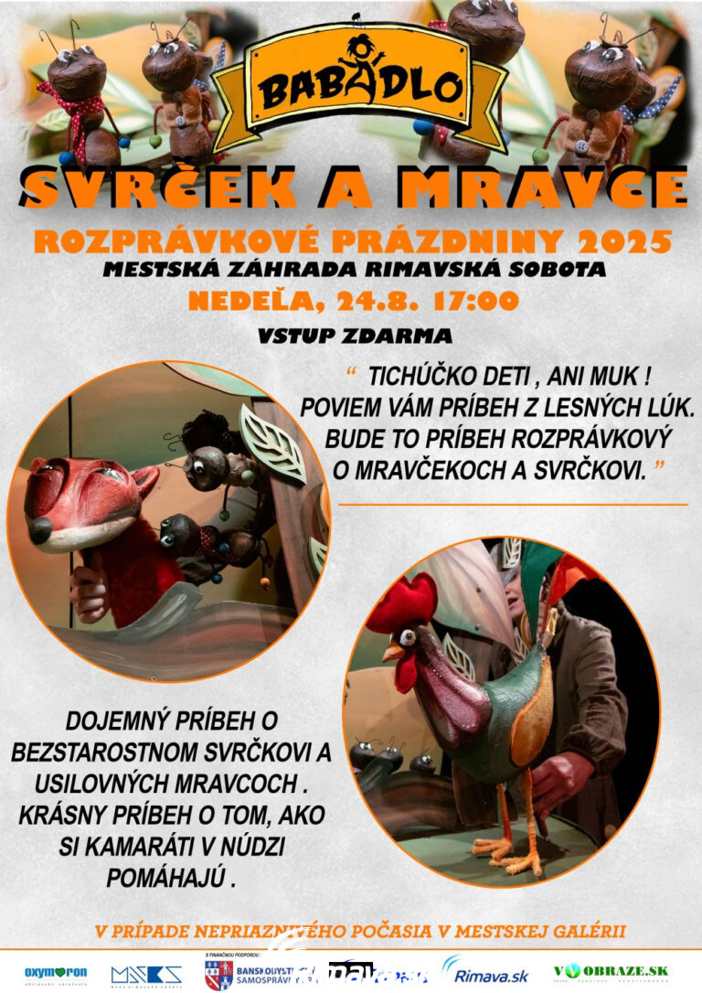 Divadlo BABADLO: SVRČEK A MRAVCE Pozývame Vás na posledné predstavenie ROZPRÁVKOVÝCH PRÁZDNIN 2025, ktoré bude v nedeľu, 24. 8. 2025 o 17.00 hod. v Mestskej záhrade. Divadlo BABADLO nám prinesie príbeh usilovných mravcov, ktorí si[...]