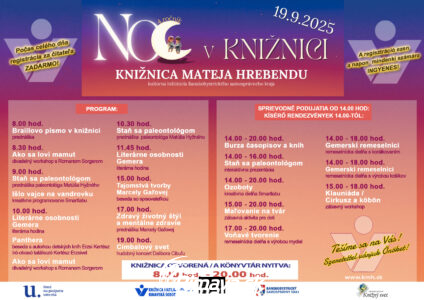 Srdečne Vás pozývame na podujatie Noc v knižnici, ktoré sa uskutoční v piatok dňa 19. septembra 2025 v priestoroch knižnice. Pripravili sme pre Vás bohatý program plný zážitkov, inšpirácie a tvorivosti – vhodný pre všetky[...]