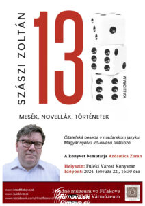 Hradné múzeum vo Fiľakove srdečne pozýva milovníkov literatúry a všetkých záujemcov na prezentáciu najnovšej knihy v tomto regióne už dobre známeho spisovateľa Zoltána Szásziho s názvom „13 – Rozprávky, poviedky, príbehy", ktorú vydalo v roku[...]