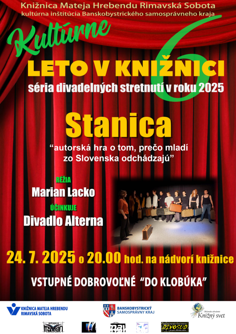 Divadelné predstavenie s názvom Stanica odohrá Divadlo Alterna. Táto autorská hra sa zameriava na aktuálnu tému odchodu mladých ľudí zo Slovenska a ponúka hlboký pohľad na dôvody, motivácie a emócie spojené s týmto fenoménom. Inscenácia[...]