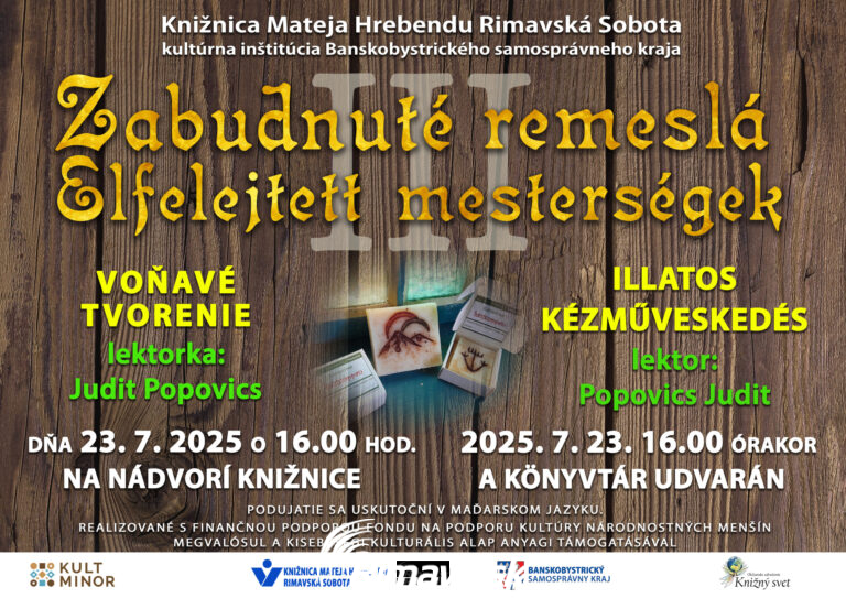 Projekt Zabudnuté remeslá 3 predstavuje sériu interaktívnych podujatí, ktoré ponúkajú deťom, rodičom a starým rodičom možnosť zažiť tradičné remeslá a preniknúť do ich histórie. Druhé stretnutie bude venované histórii mydlárstva. Pod vedením lektorky Judit Popovics[...]