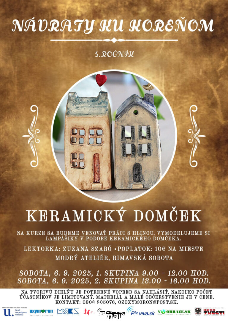 Milé dámy, srdečne Vás pozývame na tretí kurz 5. ročníka projektu NÁVRATY KU KOREŇOM, na ktorom sa budeme venovať práci s hlinou, vymodelujeme si lampášiky v podobe keramického domčeka. Stretneme sa v sobotu, 6. 9.[...]