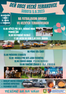 Obec Veľké Teriakovce Vás srdečne pozýva na Deň obce, ktorý sa uskutoční v sobotu, 5. 8. 2023 od 15.00 hod. na futbalovom ihrisku vo Veľkých Teriakovciach. Program: 15.00 súťaže pre deti, skákací hrad, penová šou[...]