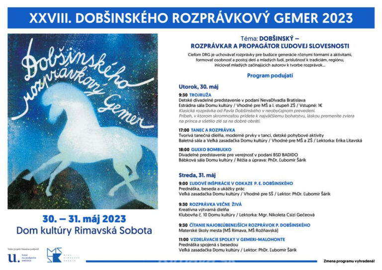 Dobšinského rozprávkový Gemer, tradičné podujatie venované zachovaniu slovenskej ľudovej rozprávky vo všetkých podobách, ktoré uskutočňujeme v RS už 28 rok, sa uskutoční 30. – 31. 5. v priestoroch DK. Súčasťou sú detské divadelné predstavenia, kreatívne[...]