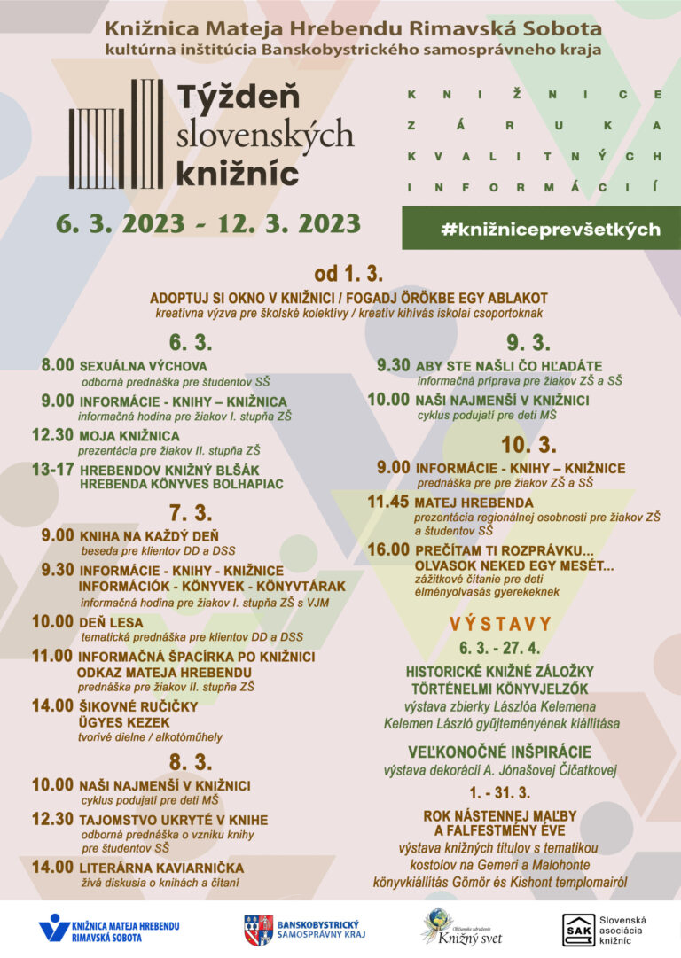 Knižnica Mateja Hrebendu Vám dáva do pozornosti kúlturno - výchovné podujatia realizované počas Týždňa slovenských knižníc.