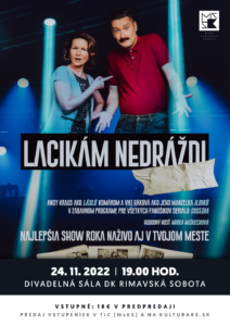 Andy Kraus a Viki Ráková sa v zábavnej show "Lacikám nedráždi" predstavia v stredu, 24. 11. o 19:00 hod. v obľúbených komediálnych postavách Lászla a Ildikó, ktoré poznáte z najúspešnejšieho slovenského sitcomu SUSEDIA. V divadelnej[...]