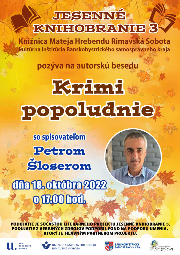 Knižnica Mateja Hrebendu Vás srdečne pozýva na stretnutie so spisovateľom Petrom Chudým, ktorý vystupuje pod pseudonymom Peter Šloser. Beseda pod názvom Krimi popoludnie sa uskutoční dňa 18. októbra 2022 o 17,00 hod. v komunitnej miestnosti[...]