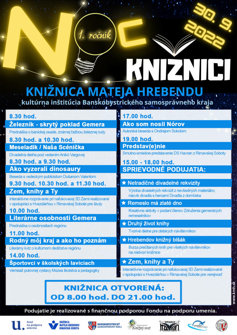 Knižnica Mateja Hrebendu Vás srdečne pozýva na podujatie pod názvom Noc v knižnici, ktoré sa uskutoční dňa 30. septembra 2022 v priestoroch knižnice. Knižnica ponúka pestrú paletu podujatí počas celého dňa a výnimočne bude otvorená[...]