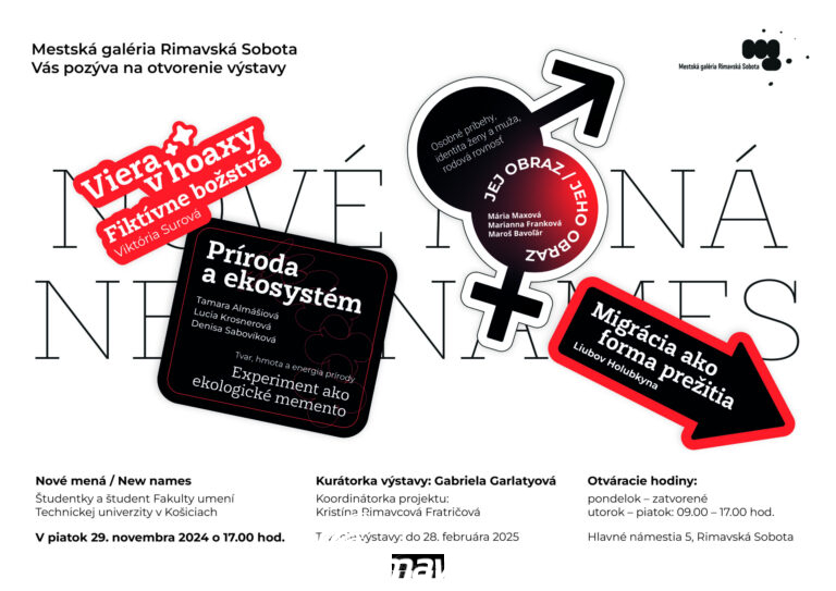 Mestská galéria Rimavská Sobota Vás pozýva na otvorenie výstavy Nové mená New names Študentky a študent Fakulty umení Technickej univerzity v Košiciach Jej obraz / Jeho obraz Osobné príbehy, identita ženy a muža, rodová rovnosť[...]
