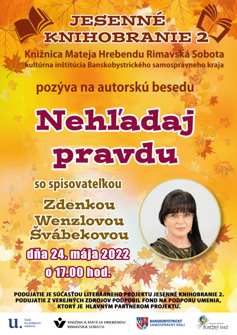 Knižnica Mateja Hrebendu Vás srdečne pozýva na stretnutie so spisovateľkou Zdenkou Wenzlovou Švábekovou. Beseda pod názvom Nehľadaj pravdu sa uskutoční dňa 24. mája 2022 o 17,00 hod. v komunitnej miestnosti knižnice. Bližšie informácie o podujatí:[...]