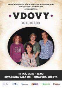DS DIVOSUD pri MsKS a štyri skvelé herečky: Naďa Garajová, Hela Chrenková, Terka Maksi a Erika Gavurová Vás pozývajú v stredu, 18. 5. o 18.00 hod. do divadelnej sály DK na premiéru hry maďarského autora Ákosa Kertésza VDOVY.[...]