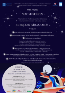 Tretia májová sobota patrí už tradične podujatiu Noci múzeí a galérií. Jej XVIII. ročník pripadne na 14. mája 2022. Počas podujatia predstavíme stálu expozíciu “Poklady minulosti” cez detaily vystavených artefaktov. Súbežne s Nocou múzeí a[...]