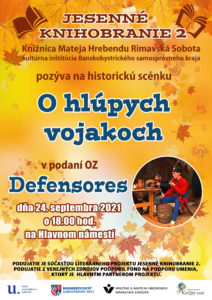 Historická scénka O hlúpych vojakoch je súčasťou projektu Jesenné knihobranie 2, ktoré je podporené Fondom na podporu umenia. Vystúpenie historickej skupiny Defensores so scénkou O hlúpych vojakoch má za cieľ oživenie histórie. Prezentuje život, odievanie,[...]