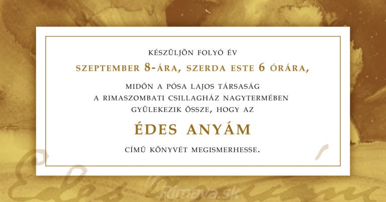 Negyedik évadához érkezett a Légy Lámpás elődás-sorozatunk. Pósa Antalné-Marcsa néni halálának 120. évfordulójára emlékezve a Pósa Lajos Társaság szeretettel vár minden irodalom kedvelőt szeptember 8-án "Pósa Lajos: Édes Anyám " c.könyv bemutatójára a rimaszombati Csillagházba[...]