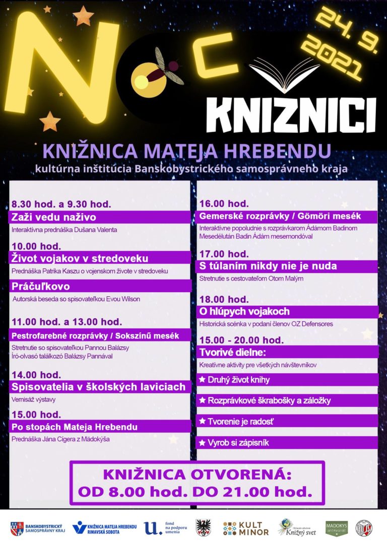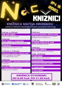 Knižnica Mateja Hrebendu uskutoční dňa 24. septembra 2021 celodenné, vzdelávacie, zážitkové i tvorivé podujatie Noc v knižnici, ktoré potrvá až do neskorších večerných hodín. Počas celého dňa budú prebiehať zaujímavé podujatia, na ktoré Vás srdečne[...]