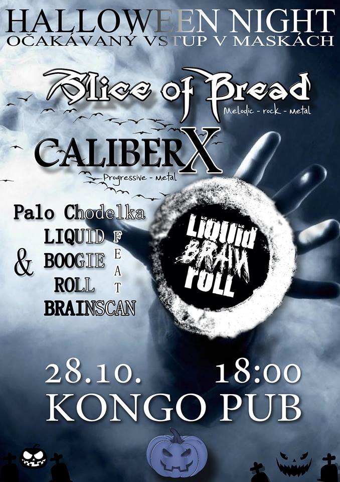Kapela SLICE OF BREAD robí zas po roku už svoju tretiu obľúbenú Halloweensku party tentokrát v Kongu, Rimavská Sobota. Vstup v maskách je vítaný. Špeciálnym hosťom celej party je výnimočné zoskupenie Liquid Brain Roll, jedinečné spojenie známeho gitaristu Paľa Chodelku a kapely Brainscan, ktoré štartuje v Rimavskej svoje jesenné a zimné klubové tour. A to ešte nie je všetko. Predstaví sa vám aj kapela CaliberX.