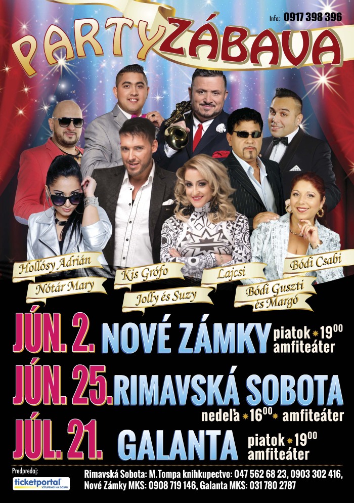 Na jedinečnej, niekoľkohodinovej megapárty sa 25. júna, od 16:00 hod. predstavia také hviezdy ako Nótár Mary, Kis Grófo, Jolly a Suzy, Lajcsi, Bódi Guszti a Margó, Bódi Csabi a Hollósy Adrián. Určite je sa na čo tešiť. Bude to podvečer plný zábavy, spevu, tanca, dobrej hudby, a to všetko pod holým letným nebom.