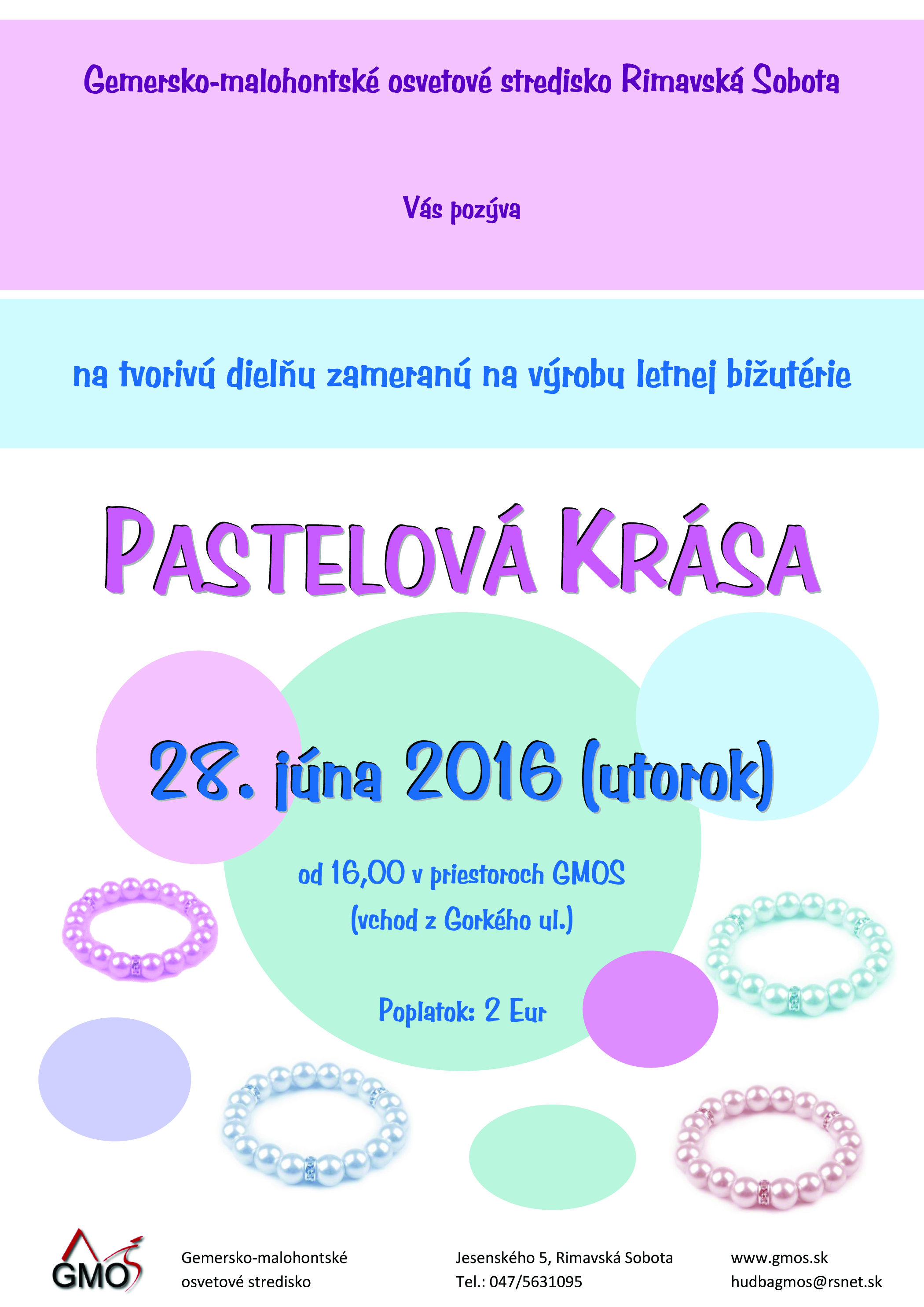 Júnová tvorivá dielňa v priestoroch GMOS bude zameraná na výrobu letnej bižutérie a šperkov vo farbách roka 2016. Ktoré sú to? Ak neviete, príďte a buďte "IN" 🙂