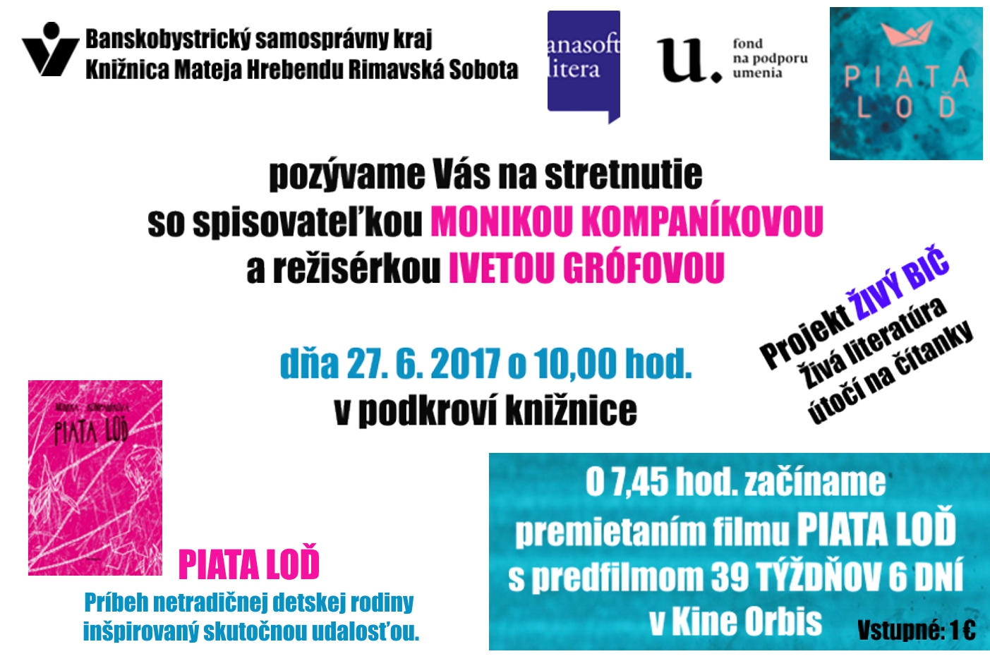 Knižnica Mateja Hrebendu Vás touto cestou srdečne pozýva na stretnutie so spisovateľkou Monikou Kompaníkovou a režisérkou Ivetou Grófovou dňa 27. júna 2017 o 10.00 hod. v podkroví knižnice. Besede bude predchádzať aj premietanie filmu PIATA LOĎ s predfilmom 39TÝŽDŇOV 6DNÍ o 7.45 hod. v Kine Orbis v Rimavskej Sobote, na ktoré Vás tiež srdečne pozývame.