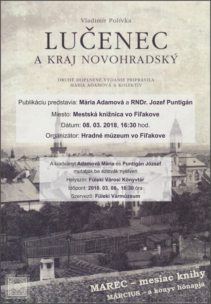 Hradné múzeum vo Fiľakove Vás srdečne pozýva na predstavenie knihy Vladimíra Polívku s názvom „Lučenec a kraj novohradský“, ktoré sa uskutoční 8. marca 2018 (štvrtok), od 16:30 hod., v Mestskej knižnici vo Fiľakove. Publikáciu predstavia Mária Adamová a Jozef Puntigán. Všetci milovníci literatúry a miestnej histórie sú srdečne vítaní!