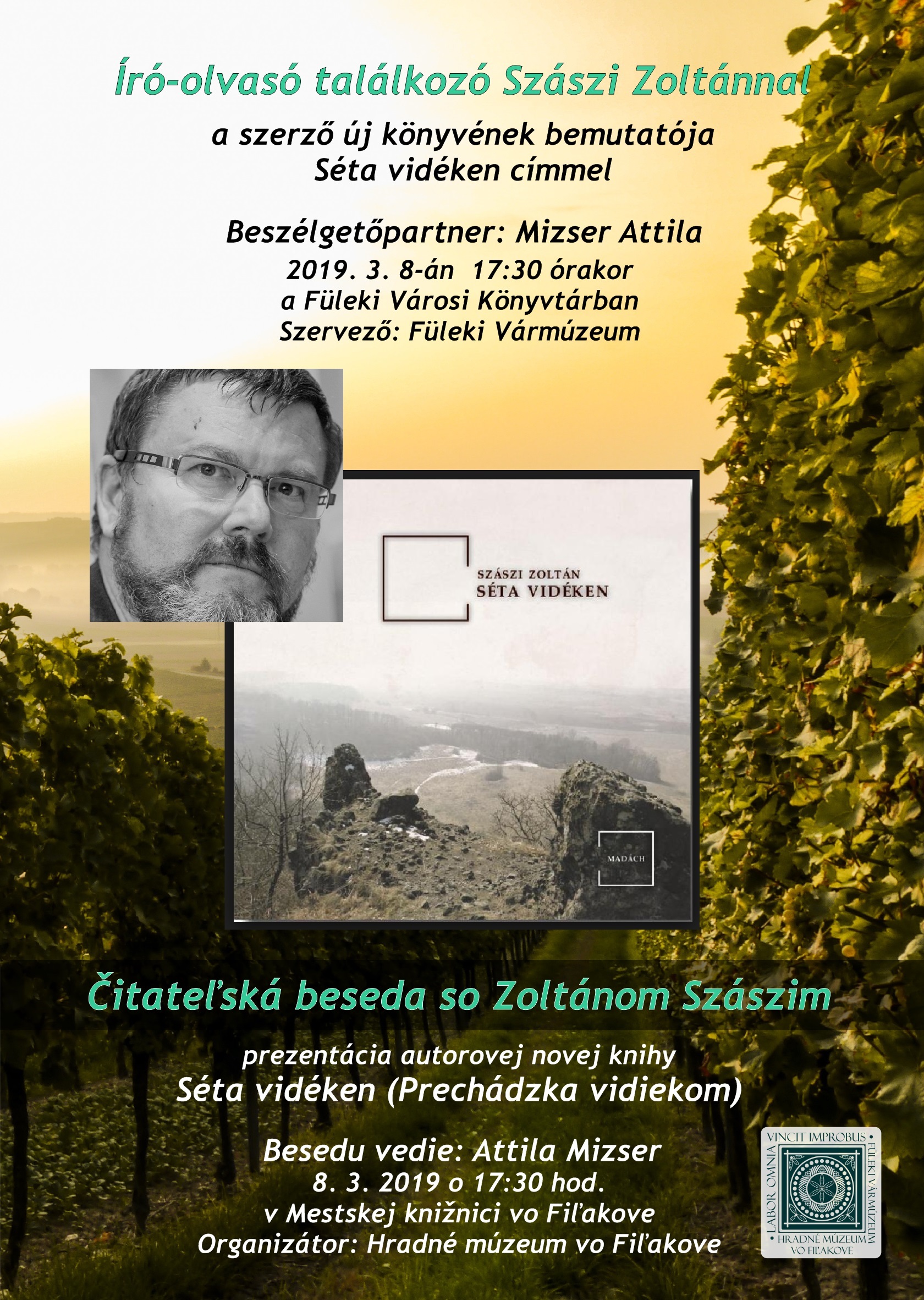 Predstavenie knihy Zoltána Szásziho s názvom „Séta vidéken“ (Prechádzka vidiekom), ktorá vyšla v minulom roku. Bohato ilustrovaná publikácia esejí je akýmsi geografickým a historickým sprievodcom regiónu južného Slovenska, územne ohraničeného od Gemerského Jablonca po Zemplín. Je názorným a obsažným výsledkom osobnej návštevy a zmapovania tejto oblasti.