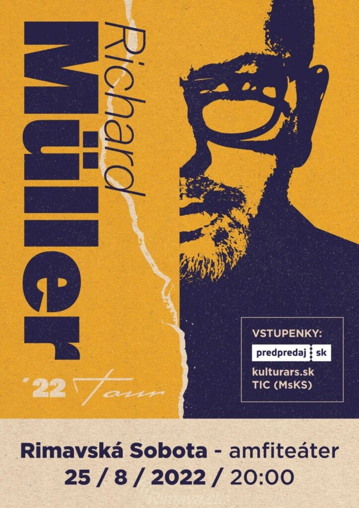 Toto leto zažijeme v Rimavskej Sobote koncert jedného z najúspešnejších a najpopulárnejších slovenských spevákov Richarda Müllera. Stretnúť sa naživo s ním i jeho hudbou vás pozývame 25. 8. 2022 o 20.00 hod. na amfiteátri. Spojenie jeho hudby, výnimočný talent, osobná charizma a nezabudnuteľný hlas sľubuje úžasný zážitok. Môžete sa tešiť na jeho veľké a všetkým známe hity, ktoré nikdy neprestanú baviť a ktoré urobili z tohto textára, skladateľa a speváka žijúcu hudobnú legendu. Vstupenky už v predpredaji online na www.kulturars.sk, aj osobne v TIC (Dom kultúry). Vstupné: 22,90 € / v deň konania koncertu 25,90 €.