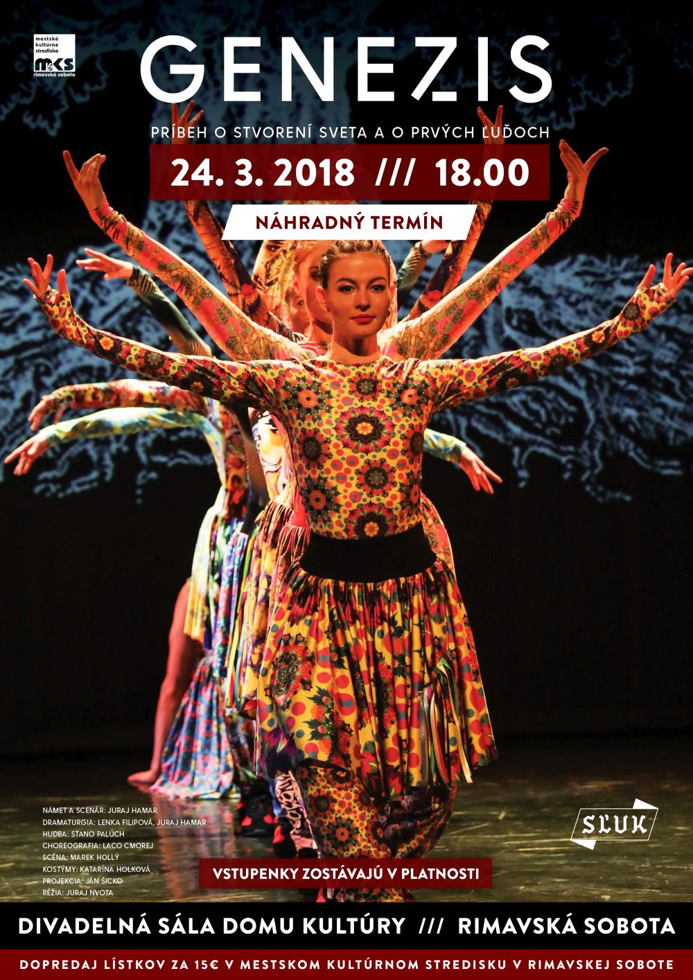 V sobotu, 24. 3. 2018 o 18.00 hod. bude náhradné predstavenie SĽUKu: GENEZIS, ktoré bolo prerušené kvôli zraneniu hlavného účinkujúceho. Ako sme avizovali hneď po dohode s manažérom predstavenia, vstupenky zostávajú v platnosti. Všetkých prosíme, ak im termín nevyhovuje, aby vstupenky darovali, alebo nás kontaktovali. Chceli by sme následne umožniť iným záujemcom vidieť toto nádherné predstavenie a preto budeme dopredávať voľné vstupenky. Vstupné: 15€, dopredaj v MsKS.