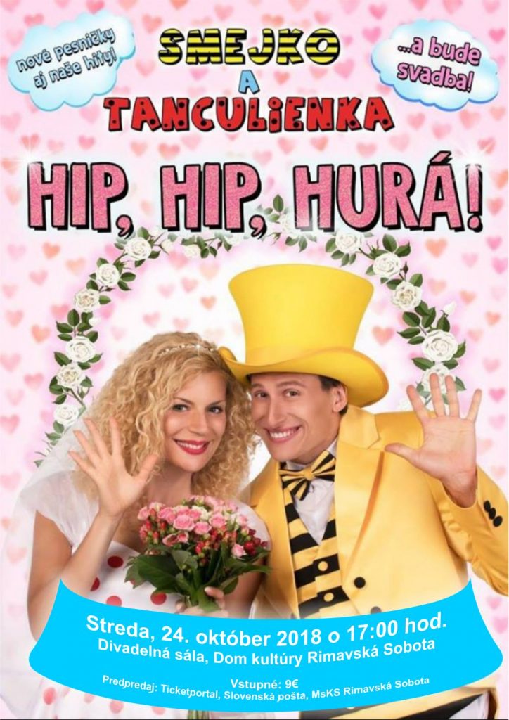 Do Rimavskej Soboty zavíta v stredu, 24. 10. o 17.00 hod. úplne nové predstavenie Smejka a Tanculienky HIP HIP HURÁ! Konečne sa dozviete ako sa Smejko a Tanculienka spoznali, skamarátili a možno prezradia aj oveľa viac v nových pesničkách a rozprávkach. Pobozká Tanculienka žabu v rozprávke Žabí princ? Premôže Smejko veľkú špinu Fúľu Bakanú? Kto je to Obor Tatroš? Vstupné: 9€, predstavenie je vhodné pre deti od 2 rokov, každá osoba, dospelý aj dieťa bez ohľadu na vek musí mať platnú vstupenku. Predaj vstupeniek v MsKS, TIC aj cez Ticketportal.