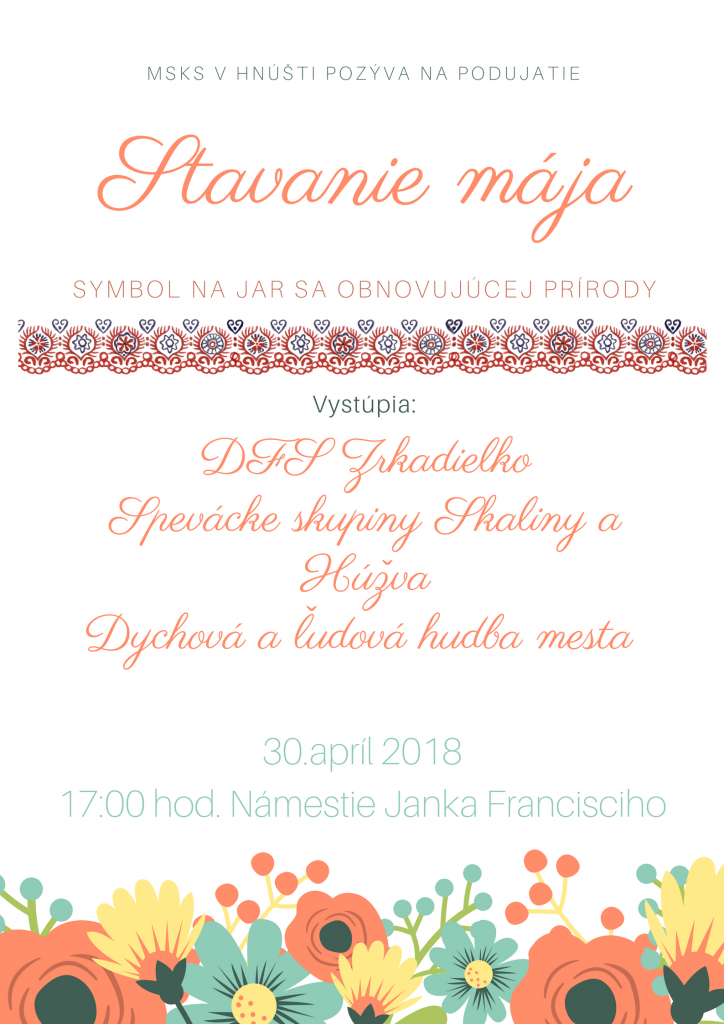Pozývame vás na tradičné stavanie mája na námestie v Hnúšti, kde od 16-tej hodiny bude hrať Dychová hudba mesta Hnúšťa. O 17-tej hodine sa v sprievode ľudovej hudby postaví máj.