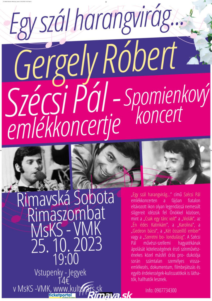Na spomienkovom koncerte známy herec a spevák, Róbert Gergely, ktorý sa oduševnene stará o umelecký a duchovný odkaz Pála Szécsiho, zaspieva najznámejšie hity v bolestne mladom veku zosnulej legendy maďarskej populárnej hudby. Vstupenky je možné zakúpiť v hodnote 14€ v Mestskom kultúrnom stredisku Rimavská Sobota (online – kulturars.sk), a na stránke Ticketportal.sk.