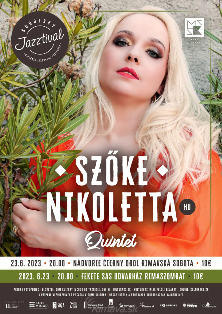 V piatok, 23. 6. 2023 o 20.00 hod. otvoríme 6. ročník SOBOTSKÉHO JAZZTIVALU prvým koncertom. Na nádvorí Čierneho orla vystúpi špičková maďarská jazzová speváčka Szőke Nikoletta s vynikajúcou partiou muzikantov: Zsolt Csókás / gitara, Norbert Kardos / klávesy, József Barcza Horváth / basgitara, kontrabas a László Balog / bicie. Vstupné: 10€, predaj vstupeniek v DK a online na kulturars.sk.