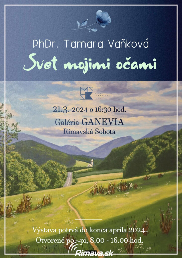 Všetkých milovníkov výtvarného umenia pozývame vo štvrtok, 21. 3. 2024 o 16.30 hod. do Galérie Ganevia na vernisáž autorskej výstavy Tamary Vaňkovej Svet mojimi očami. Pani Tamara je rodáčka z Hnúšte a pred šiestimi rokmi sa opäť vrátila do regiónu a žije v Rimavskej Sobote. Od útleho detstva rada kreslila a maľovala. Tesne pred dôchodkom, vo svojich 60-tich rokoch, sa rozhodla vrátiť k maľovaniu, čomu sa venuje doteraz ako amatér samouk. Vo svojich obrazoch sa snaží zobraziť predovšetkým prekrásnu slovenskú prírodu a náš krásny región. Výstava potrvá do konca apríla 2024. Otvorené: po. – pi., 8.00 – 16.00 hod. Vstup zdarma.