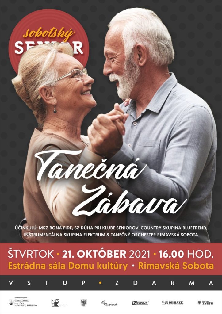 Všetkých seniorov, ktorí sa radi zabavia, alebo si zaspomínajú na staré dobré časy tancovačiek, pozývame vo štvrtok, 21. 10. o 16.00 hod. do Domu kultúry na Tanenčnú zábavu. Účinkujú: MSZ Bona fide, SZ Dúha, country kapela Bluetrend, Elektrum a Tanečný orchester mesta Rimavská Sobota. Vstup zdarma. Čaká Vás príjemná atmosféra, stretnutie s priateľmi, malé občerstvenie. Podujatie je súčasťou projektu Sobotský Seniorfest, ktorý realizujeme s finančnou podporou Ministerstva kultúry SR.