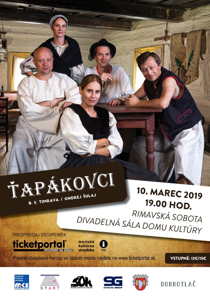Po mimoriadne úspešnom jesennom turné sa Ťapákovci opäť vydávajú na cesty naprieč Slovenskom. Od februára si budete môcť užiť toto unikátne predstavenie až v 10 mestách vrátane Rimavskej Soboty, kde zavítajú v nedeľu, 10. 3. 2019 o 19.00 hod. Príďte si vychutnať atmosféru v ťapákovskej izbe a presvedčte sa spolu s nami, že za 100 rokov sa toho u nás až tak veľa nezmenilo. Vstupné: 13€ / 15€ podľa sedenia. Predaj vstupeniek v MsKS, TIC a cez Ticketportal.