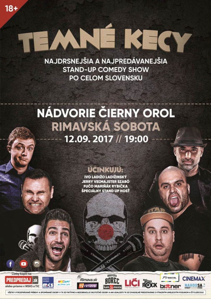 Miluješ sa zabávať tak, že si myslia, že si nesvojprávny? Tak si na správnom mieste. Temné Kecy totiž robia najtemnejší humor na scéne a to je to, čo chceš podporiť, tak si zakúp lístok na najdrsnejšiu a najpredávanejšiu stand-up comedy show v Rimavskej Sobote a veríme, že sa v utorok 12. 9. o 19.00 hod. vidíme v Čiernom orlovi! Účinkujú: Ivo Ladižo Ladižinský, Jerry Veľmajster Szabó, Fučo Mariňák Rybička a špeciálny stan up hosť. Vstupné: 15€, predpredaj v TIC a MsKS aj cez predpredaj.sk.